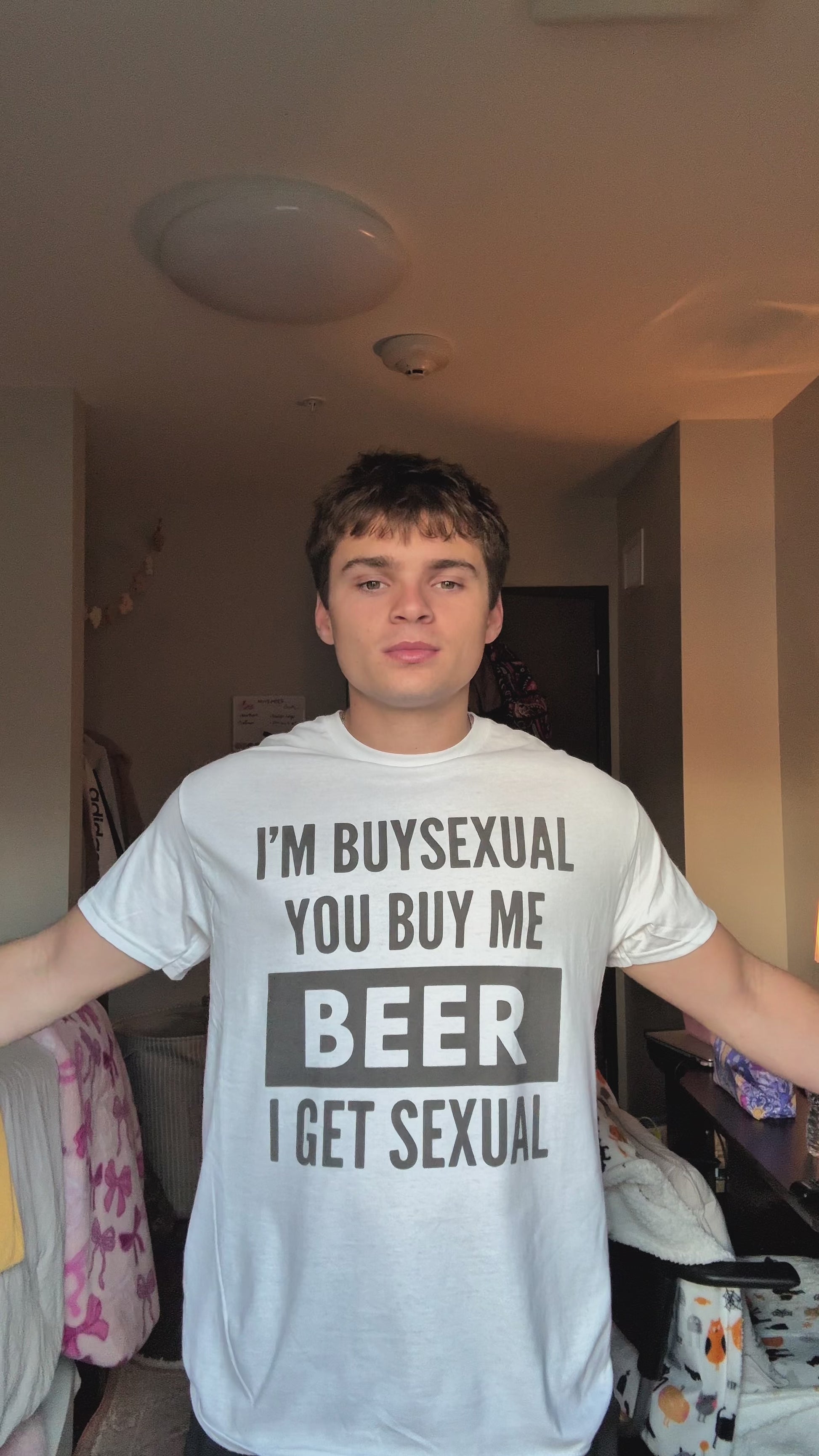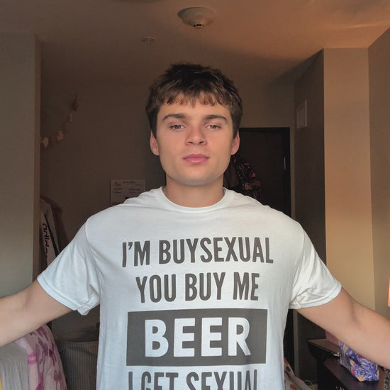 Design: Bold “I’m Buysexual – You Buy Me Beer, I Get Sexual” graphic in high-contrast white print